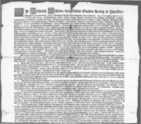De Koninklijke commissarissen tot in bezitname van het Pruisisch Overkwartier maken bekend dat bij de Vrede van Utrecht de stad Geldern, alsmede de steden, ambten en heerlijkheden Straelen, Wachtendonck, Middelaar, Walbeck, Arcen, Afferden, Well, Ray en Klein-Kevelaer, alsmede Krieckenbeck en het land en ambt van Kessel aan de koning van Pruisen zijn afgestaan. <\n>De ingezetenen, alsmede de geestelijke en wereldlijke vazallen dienen voortaan enkel het gezag van de Pruisische koning te erkennen en aan zijn geboden en verboden te gehoorzamen. Alle landsheerlijke inkomsten en belastingen dienen voortaan aan hem te worden afgedragen. De Pruisische koning belooft zijnerzijds de rechten en privileges van zijn nieuwe onderdanen te zullen handhaven.Plaats van uitvaardiging: Geldern -