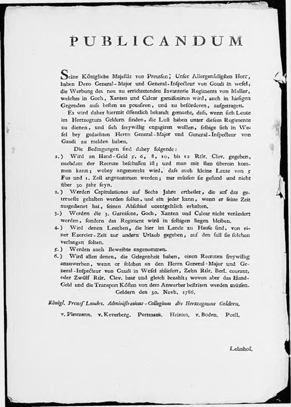 Publikatie ter zake van de recrutering van soldaten voor het regiment von Muller