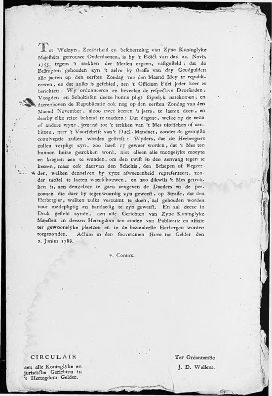 Onder verwijzing naar (? 1755-11-22) worden de koninklijke en heerlijke gerechten in Pruisisch Gelre herinnerd aan de verplichting tot jaarlijkse herpublikatie op de eerste zondag in mei. Deze verplichting wordt verdubbeld: voortaan dient de veordening ook op de eerste zondag van november opnieuw te worden gepubliceerd. Bij die gelegenheden moet telkens worden bekend gemaakt, dat overtreders zonder conniventie zullen worden gestraft. Herbergiers dienen te worden herinnerd aan de aangifteplicht in geval zich een steekincident in hun etablissement voordoet. De circulaire dient op alle gebruikelijke plaatsen te worden aangeplakt, alsmede aan de herbergen te worden toegezonden.