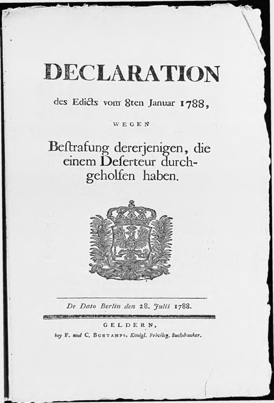 (? 1788-01-08) ten vervolge, wordt ter wegneming van twijfel over de bestraffing van degenen die deserteurs bij hun vlucht behulpzaam zijn, bepaald welke strafmaat dienaangaande afhankelijk van verzachtende omstandigheden, of verzwarende omstandigheden, zoals recidive, moet worden gehanteerd.