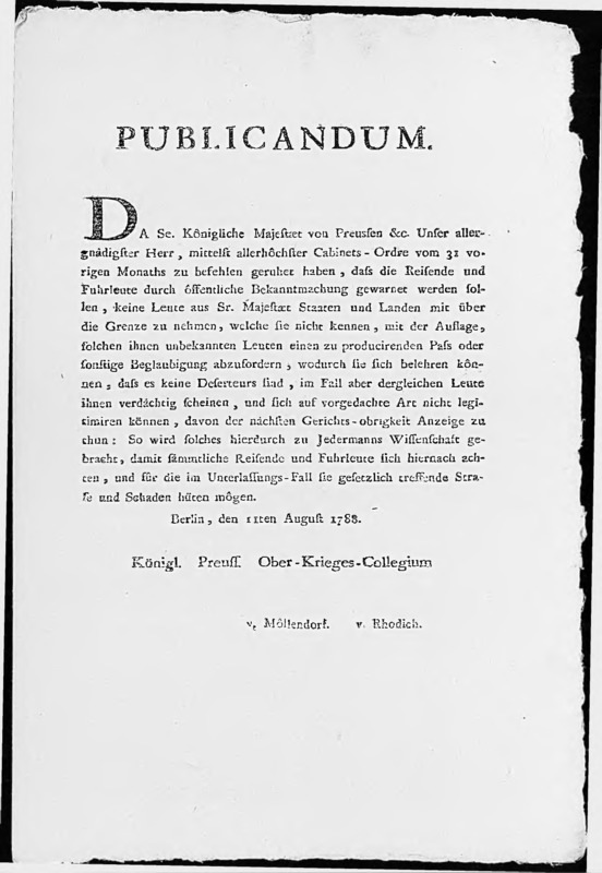 Het Ober-Krieges-Collegium waarschuwt voerlieden en reisenden geen onbekenden mee te laten reizen over de landsgrenzen, tenzij zij door middel van een paspoort kunnen aannemelijk maken, dat zij geen deserteurs zijn.