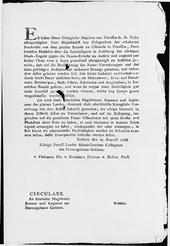 Het Landes Administrations Collegium maakt bekend dat de koning naar aanleiding van een grote brand in Osterode (Pruisen)zijn bezorgdheid heeft uitgesproken over gebrekkige naleving van de brandverordeningen. De lokale overheden worden vermaand streng toezicht uit te oefenen, Nalatigheid zal exemplarisch worden gestraft.
