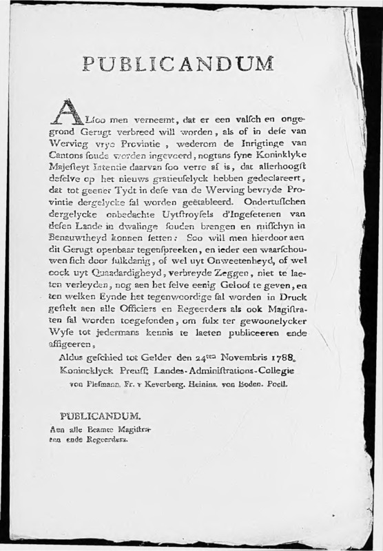Publikatie ter zake het werven van militairen in Pruisisch Gelre