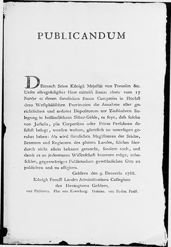 Het Landes Adminsirations Collegium maakt bekend dat de bankkantoren in de Westfaalse provincies geen gelden van gerechten, pieuze fundaties of particulieren mogen aannemen ter belegging in obligaties, rentedragend in Hollands zilvergeld.