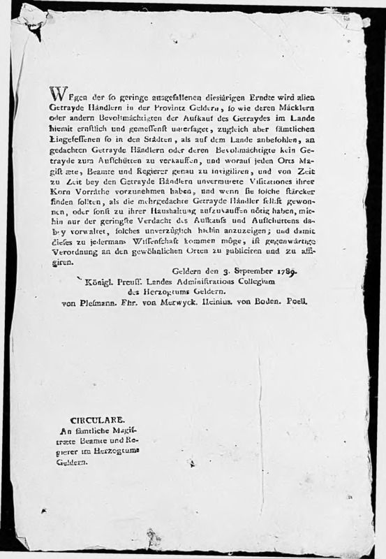 I.v.m. graanschaarste wordt het aan opkopers en makelaars in graan verboden voorraden in Pruisisch Gelre op te kopen. Lokale overheden dienen toe te zien op de naleving van het verbod door visitatie van korenvoorraden en pakhuizen.