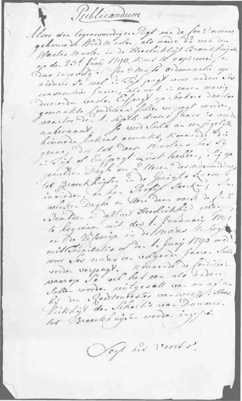 Publikatie van de verpachting in Broekhuizen van de nieuwe windmolen, de watermolen, de visvangst en van bemden