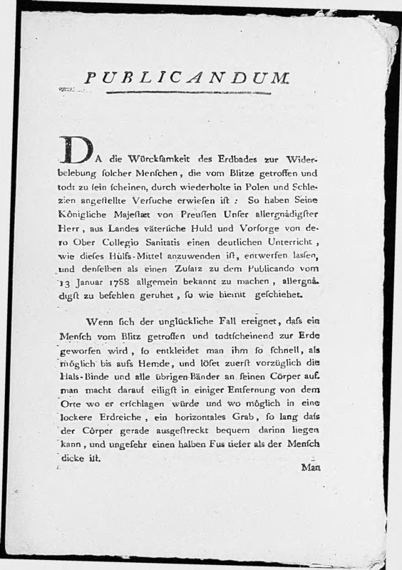 In aanvulling op (? 1788-01-13) wordt bekend gemaakt op welke wijze men dient te handelen, indien een persoon in het open veld door de bliksem getroffen is. Het verdient aanbeveling zo'n persoon in een ondiep graf te leggen, zodanig, dat zijn gezicht vrij blijft en hem met helder water te begieten. Een eventueel herstel zal binnen drie uren intreden.