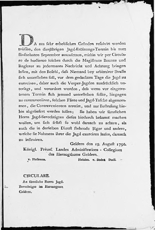De opening van de jacht wordt uitgesteld tot 15 september. Overtreding van de het jachtverbod wordt arbitrair gestraft met een geldboete en inbeslagname van vuursteengeweren en jachttassen.