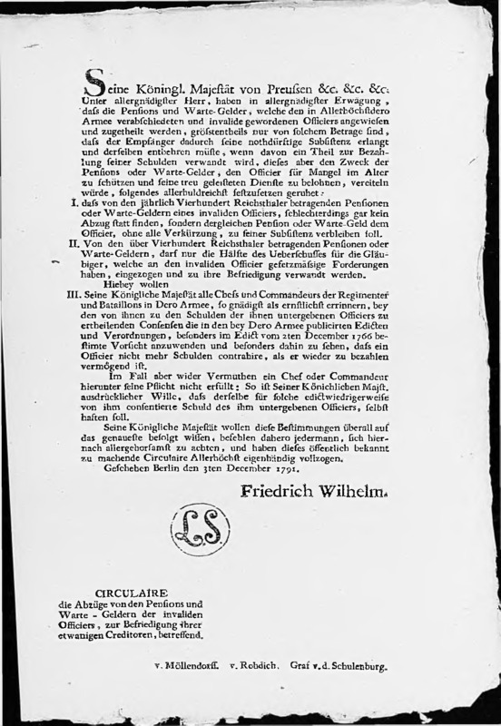Krediteuren mogen geen beslag leggen op het pensioen of wachtgeld van invalide officieren tot een bedrag van 400 rijksdaalders. Indien de officier een hogere uitkering geniet, mag op het meerdere voor de helft beslag gelegd worden. De meerderen van desbetreffende invaliden worden vermaand, conform (? 1766-12-02) toe te zien, dat hun ondergeschikten geen schulden aangaan, die hun draagkracht te boven gaan.