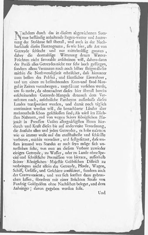 In verband met dreigende schaarste ten gevolge van overmatige regenval verbiedt het Landes Administrations Collegium de uitvoer van graan, veevoer, erwten, bieten, wortelen, aardappelen en dergelijke levensmiddelen uit Pruisisch Gelre. <br>Dit verbod geldt niet voor de uitvoer naar het Oostenrijkse en Staatse Overkwartier, aangezien afspraken zijn gemaakt over wederkerige vrijhandel van gewassen, veevoer en levensmiddelen. Naast de gebruikelijke straffen van confiscatie van contrabande en vervoersmiddelen, riskeert de overtreder een verzwaarde boete. <br>Tevens wordt tot nader order het stoken van brandewijn verboden. De helmen van distilleerketeles dienen door de lokale overheden te worden ingenomen.<br>De lokale overheden en licentbedieneden dien op de naleving van de verordening toe te zien op fiscale straffe.