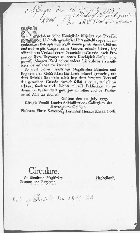 Het Landes Administrations Collegium maakt bekend, dat de koning bij rescript van 28 juni 1773 heeft goedgevonden, dat kerkelijke instelling kunnen meebieden op gemene gronden en dat deze gronden aan hen kunnen worden toegewezen naar rato van hun bijdrage in de kerspellasten.