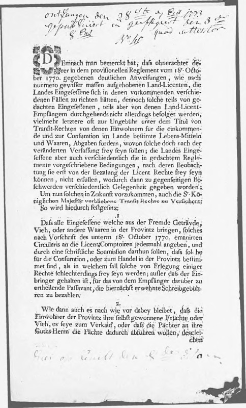 (? 1770-10-18) ten vervolge wordt bepaald, dat de ingezetenen van Pruisisch Gelre die goederen voor eigen gebruik invoeren, of eigen producten uitvoeren, dit vrij van licenten mogen doen; wel dienen zij van deergelijke transporten aangifte te doen bij de licentkantoren, alwaar zij tegen betaling van schrijfloon de benodigde paspoorten zullen ontvangen. Het Landes Administrations Collegium bepaalt middels deze publikatie de hoogte van het schrijfloon.