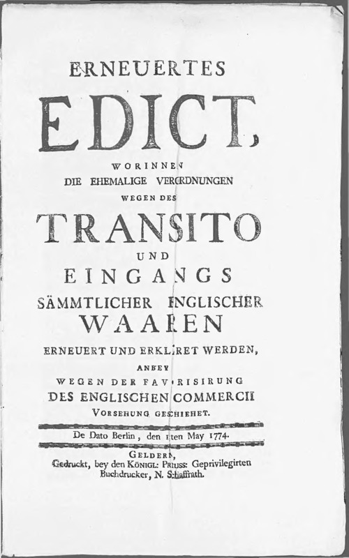 Omdat bestaande verordeningen ter bevordering van de handel met Engeland door beambten van tollen, licenten en eaccijnzen ojuist worden toegepast, worden zij vernieuwd en toegelicht. Ten aanzien van het transitorecht wordt bepaald, dat in de Westfaalse provinciën, Pruisisch Gelre daaronder begrepen, geen transitorecht geheven zal worden van Engelse koopwaren. Ten aanzien van tolheffing geldt, dat Engelse koopwaar op gelijke wijze belast dient te worden als Pruisische koopwaren. Ten aanzien van ingevoerde producten, comsumptiegoederen, grondstoffen en fabrikaten, geldt dat hierover in de Westfaalse provinciën geen accijzen verschuldigd zijn, met uitzondering van stedelijke belastingen.
