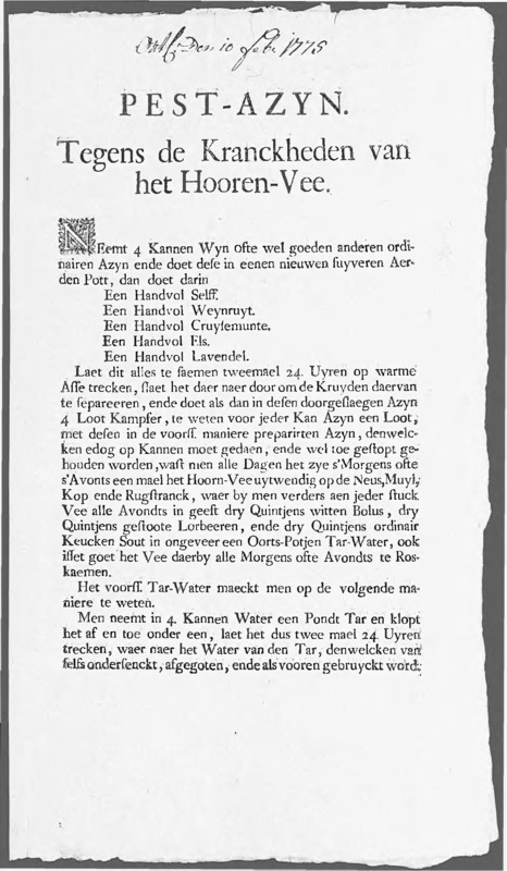 Bekendmaking van de bereiding van een pest-azyn als geneeswijze voor veeziekte