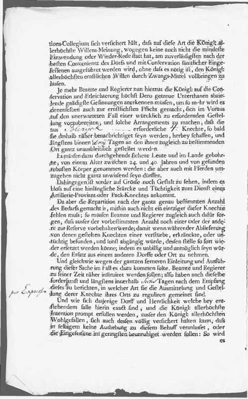Het Landes Administrations Collegium heeft een repartitie gemaakt van in oorlogstijd door Pruisisch Gelre te leveren artillerie-, provinand en pak-knechten. De lokale overheden dienen zorg te dragen voor de levering van het quotum van hun district, op straffe van persoonlijk verantwoordelijk te worden gehouden.