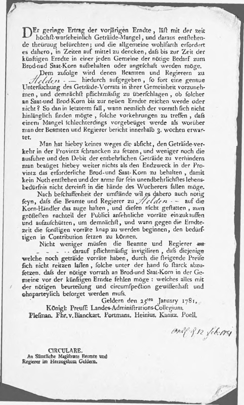 Het Landes Administrations Collegium draagt de lokale overheden op in verband met de graanschaarste toezicht te houden op de voorraden brood- en zaai-koren en te waken tegen prijsopdrijving en graanwoeker.