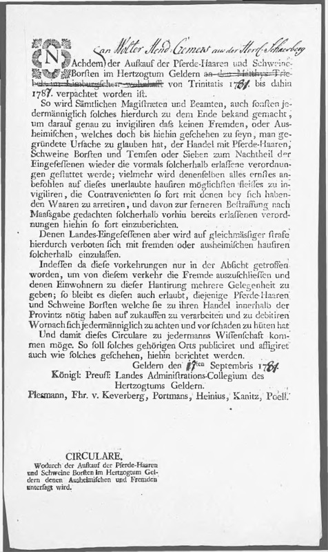 In het kader van de verpachting van de handel in paardenhaar en varkensborstels aan Wolter Hendrik Cremers uit Schaesberg voor de periode Trinitatis 1781-1787 verbiedt het Landes Administrations Collegium uitheemsen en vreemdelingen deze handel.