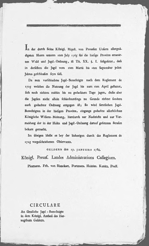 Volgens de Wald und Jagd-ordnung (? 1765-07-01) is de jacht in de periode 1 maart tot 1 september gesloten. Volgens het jachtreglement (? 1725-07-19) duurt het jachtseizoen echter tot 1 april. Voortaan dient het voorschrift van de Wald und Jagd-ordnung te worden gerespecteerd; voor het overige blijft het jachtregelement van 1725 van kracht.
