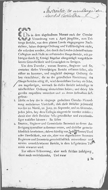 Het Landes-Administrations-Collegium, dat verantwoordelijk is voor de indiening van rapportages aan het General-Direktorium, is daarvoor afhankelijk van kwartaalberichten van de lokale overheden. De circulaire geeft voorschriften voor de inrichting van desbetreffende kwartaalberichten.