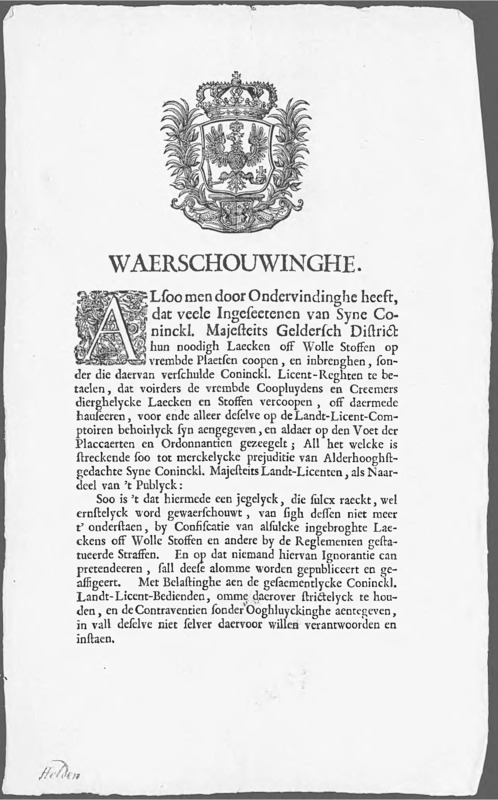 Aangezien het licent op de invoer van laken en wollen stoffen in Pruisisch Gelre op grote schaal wordt ontdoken, wordt eenieder gewaarschuwd, dat de overtreding van desbetreffende reglementen streng zal worden gestraft. De licentbeambten dienen fraude zonder oogluiking aan te geven.