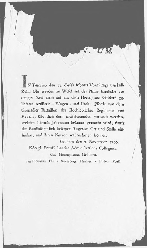 Publikatie ter zake van de openbare verkoop van pakpaarden en een artilleriewagen
