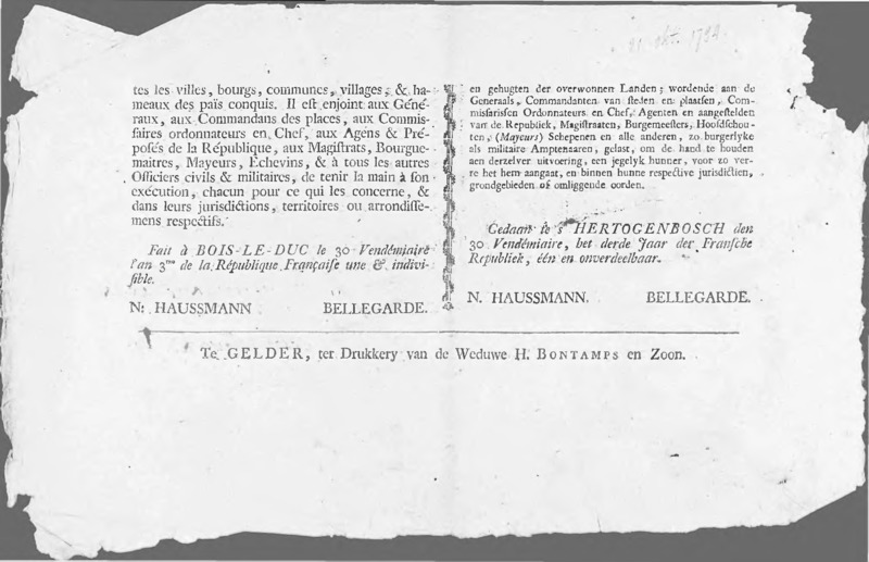 s-Hertogenbosch 1794-10-21 N. Haussmann, Bellegarde gedrukt Frans en Nederlands De publikatie werd uitgevaardigd onder verwijzing naar de publikatie d.d. 6 oktober 1794 Veroverde gebieden Geldern Weduwe H. Bontamps en Zoon