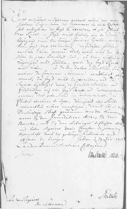 Het Landes Administrations Collegium heeft vernomen, dat in het Land van Kessel sommige personen, die niet tot de jacht gerechtigd zijn, ten onrechte gebruik maken van door generaal Gastine ondertekende jagerspassen. De lokale overheden dienen tegen dit misbruik op te treden en de gebruikelijke boetes op te leggen.