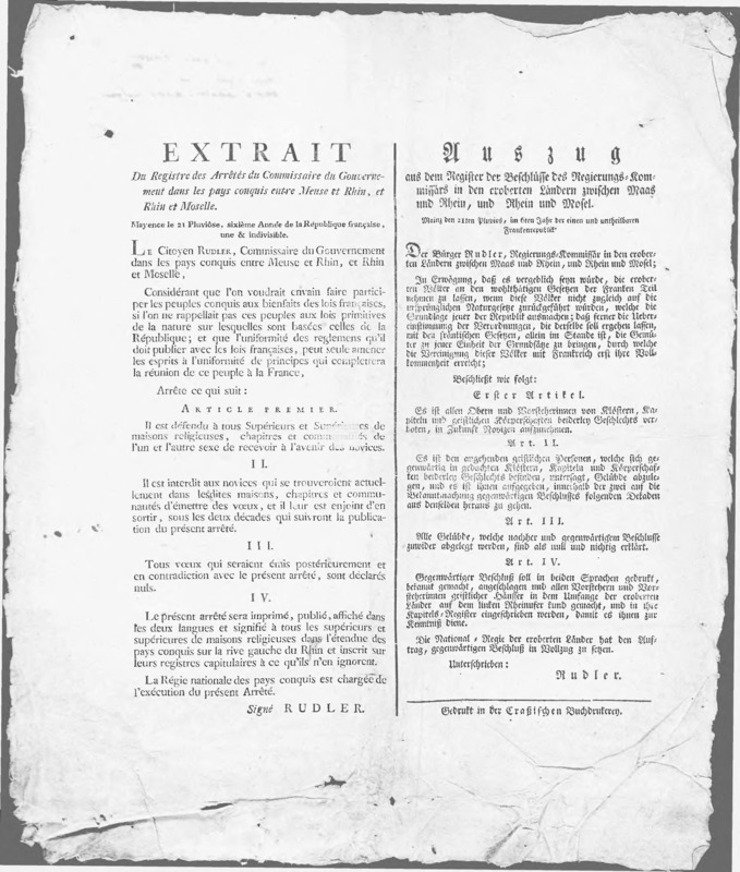 De Commissaris gouvereneru in de veroverde gebieden tussen Maas en Rijn en Rijn en Moezel, Rudler, draagt de Régie Nationale in de veroverde landen op, ervoor zorg te dragen, dat in conformiteit met de Franse wegeving, kloosters in de bezette gebieden geen novicen meer aannemen of tot het afleggen van de kloostergeloften toelaten.