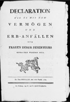 Indien een gehuwde militair deserteert, dient conform (? 1764-11-17) eerst gerechtelijk te worden vastgesteld of diens echtgenote medeplichtig is. Indien zij niet medeplichtig is, behoudt zij haar inge\nachte vermogen, alsmede hetgeen waartoe zij conform de lokale costumen in het gemeenschappelijke vermogen gerechtigd is. Het gemeenschappelijke vermogen dient echter gerechtelijk te worden geadministreerd, totdat het overlijden van de deserteur is bewezen, of totdat de gerechtelijke echtscheiding is uitgesproken. <\n> Indien de echtgenote komt te overlijden alvorens zij zich als gerechtigde tot het vermogen van de gedeserteerde echtgenoot kan kwalificeren, dan vervalt het aandeel van de man in het vermogen aan de Invalidenkas, het overige vervalt aan de erfgenamen van de echtgenote in kwestie.Plaats van uitvaardiging: Berlijn -